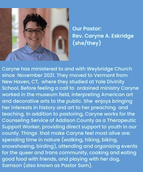 - Worship with Pastor Caryne A. Eskridge November 23, 2025 at 10:00 am – 11:00 am Weybridge Congregational Church, 2790 Weybridge Rd, Weybridge, VT 05753, USA
